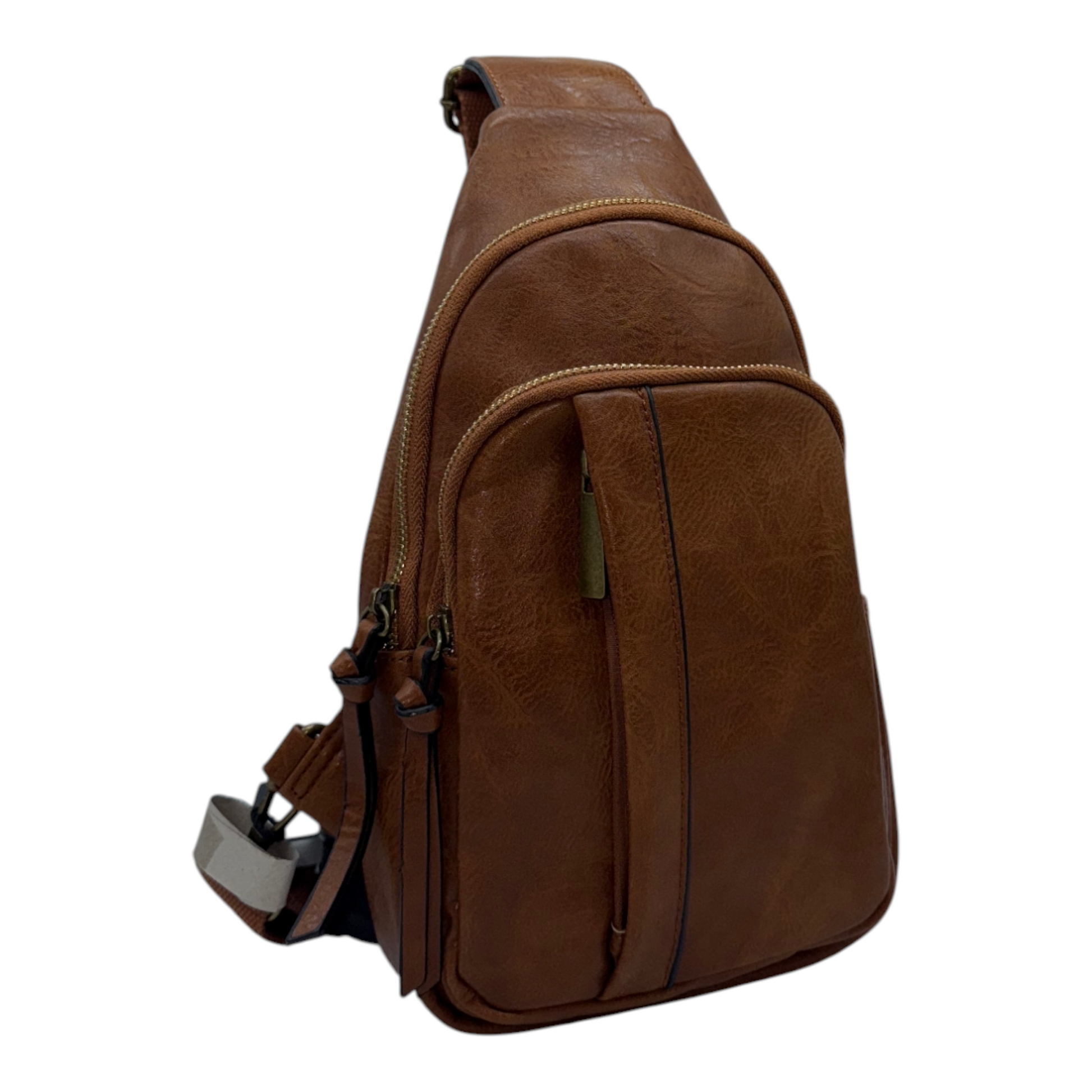 Opta por la comodidad y el estilo con nuestro bolso bandolera/mochila sling, la elección perfecta para quienes buscan un accesorio práctico y con carácter para el día a día. Fabricado en cuero vegano de alta calidad con un acabado en tono marrón camel o coñac y un efecto ligeramente desgastado, este bolso evoca una estética vintage y robusta.