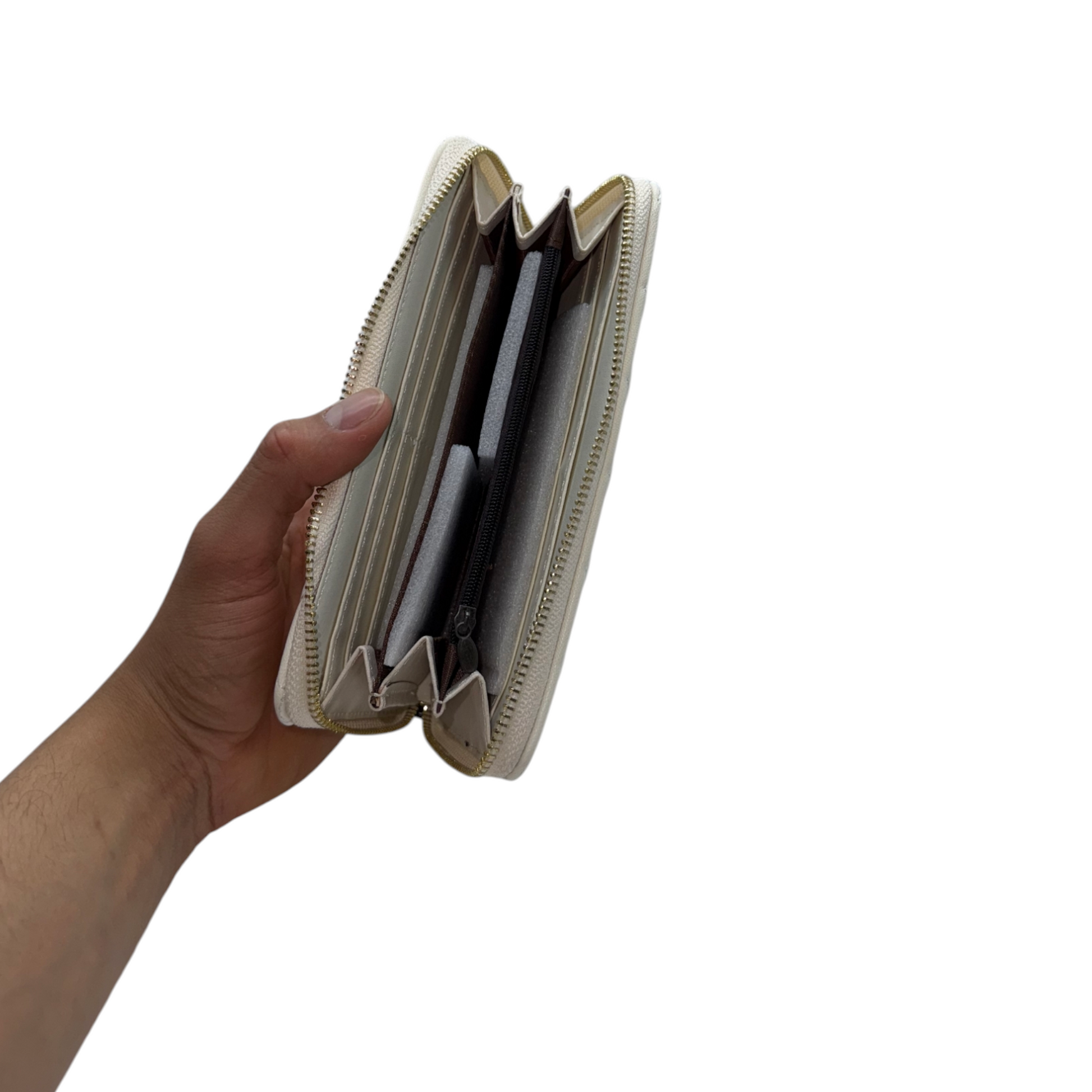 - Interior: Amplios compartimentos, ranuras para tarjetas, bolsillo central con cremallera para monedas/objetos pequeños, espacio para billetes.